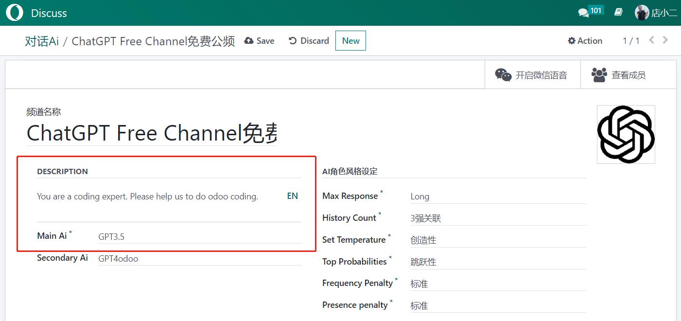 5. Bind your Ai User to Channel from Discuss. We already setup a sample.