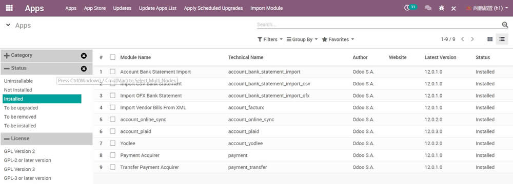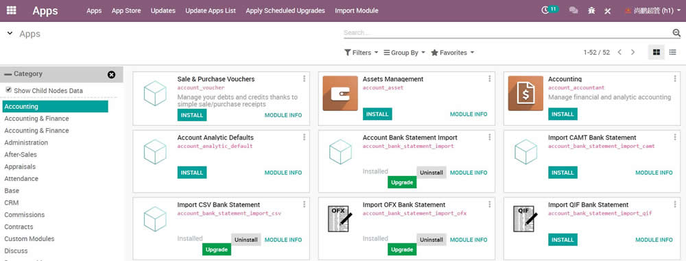 Browse Apps by category tree. Browse Module by category. Use for parent children tree list kanban navigator.