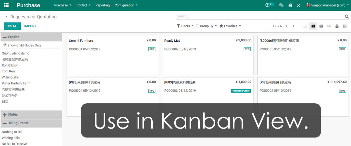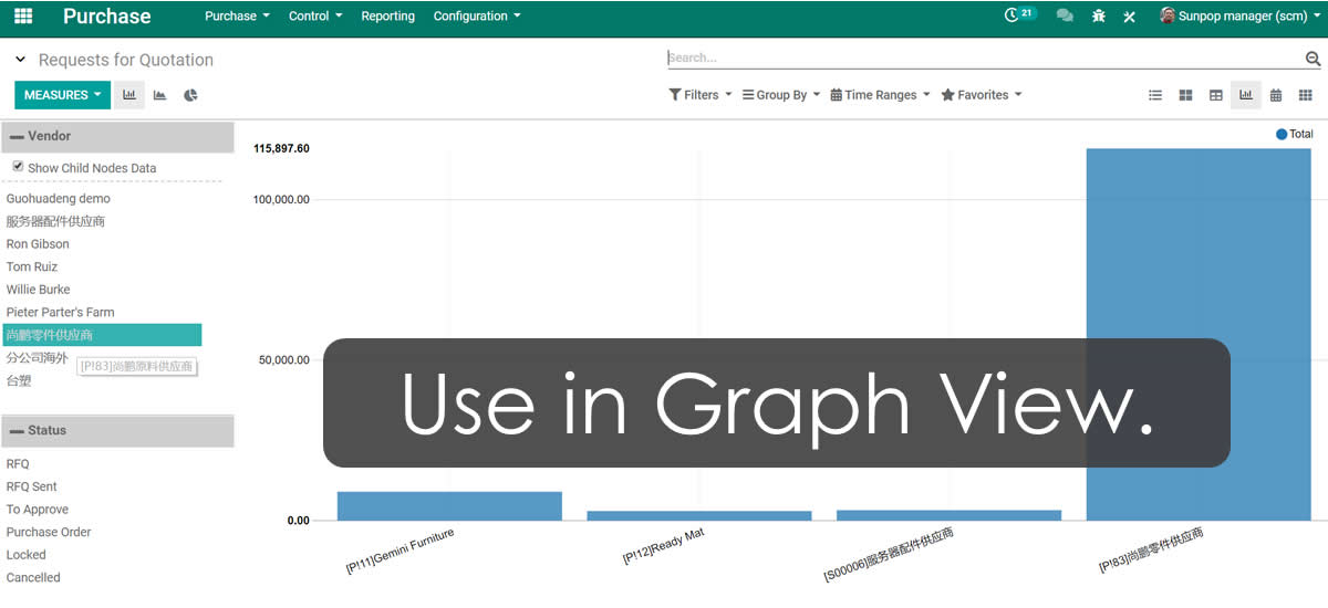 Easy to navigator and browse any data. Support list, kanban, pivot, graph view.