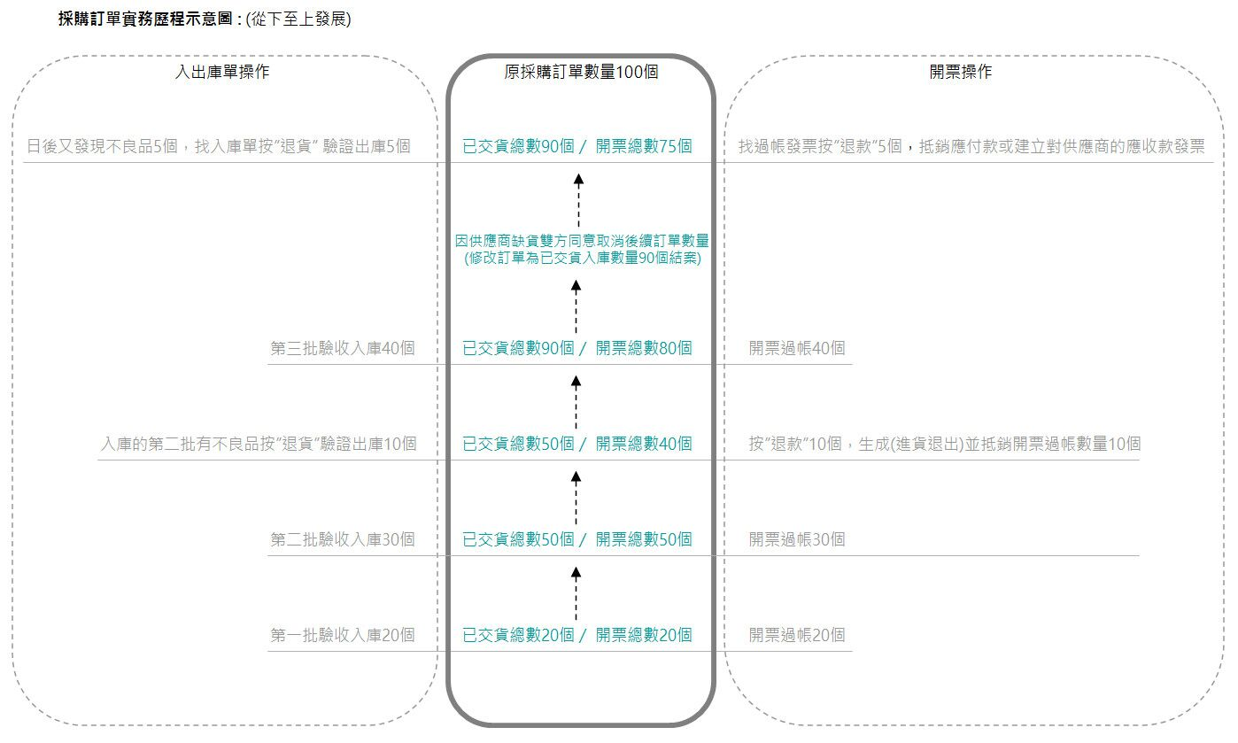 6. 因供货商缺货,双方协商同意取消后续订单数量,修改订单为已交货入库数量90个(含已退货的10个),并取消后续入库单后结案7. 日后又发现不良品5个,找出入库单按”退货” 验证出库5个+ 找过帐发票按退款并且抵销应付款或建立对供货商的应收款发票
