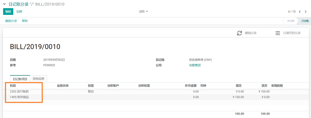 后面发票收到时把暂估入库单冲红并做正常采购收货单。此处在原分录上点击【撤销分录】,则自动生成新的分录,【退款BILL/2019/0010】