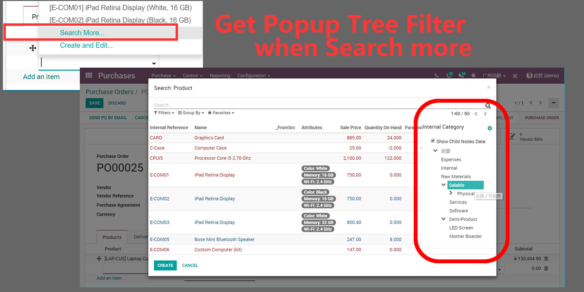 树状视图算是最重要的一个,这个该是国内国际各大厂商的标配了,在财务、分组目录、地理位置等实际应用中十分常见。所以,实现父子关系的树状视图绝对是打单的重头戏,针对odoo11,12的前端大变化,我们开发了相关的模块,包括在单条记录中使用树状选择(如目录、科目),在列表、看板中使用树状列表导航查询,全部使用odoo标准的开发方式,widget实现,简单的xml设置。