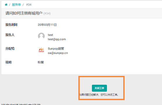问题解决后,客户的工单界面下方有【关闭工单】按钮,客户认为问题已解决,可以直接关闭,然后评分。