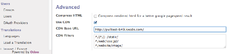 In the Odoo back end, go to the Website Settings: menu, then activate the CDN support and copy/paste your zone URL in the CDN Base URL field. This field is only visible and configurable if you have developer mode activated.