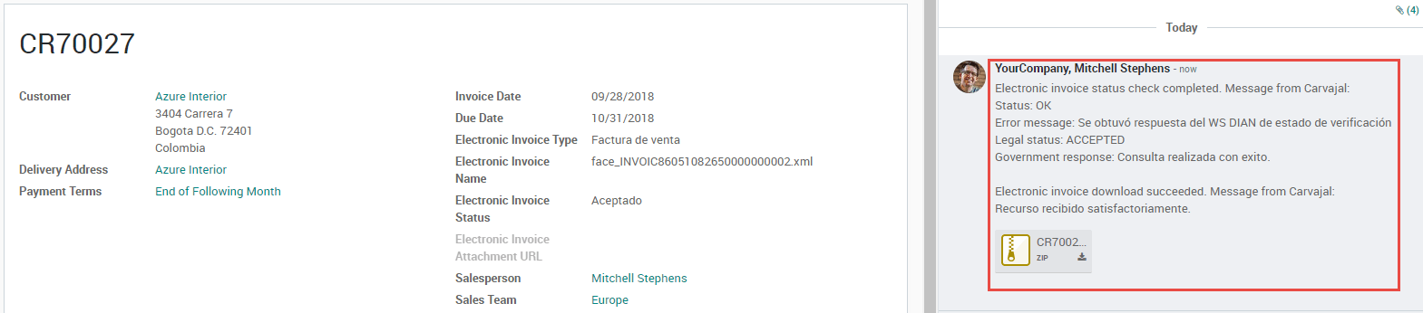 After the invoice is validated an XML file is created and sent automatically to Carvajal, this file is displayed in the chatter.