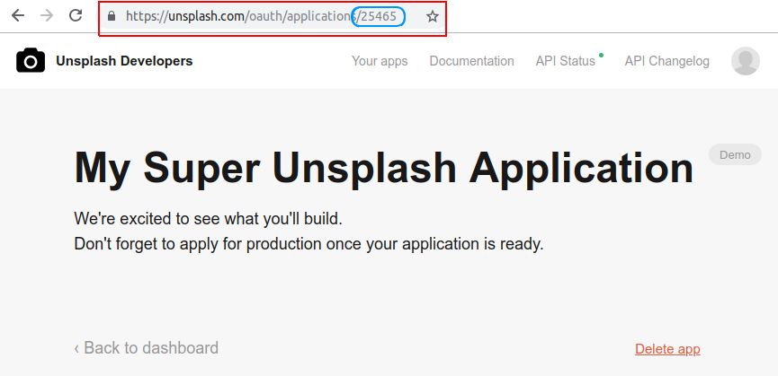 - Go to your applications dashboard and click on your newly created Unsplash application under Your applications.