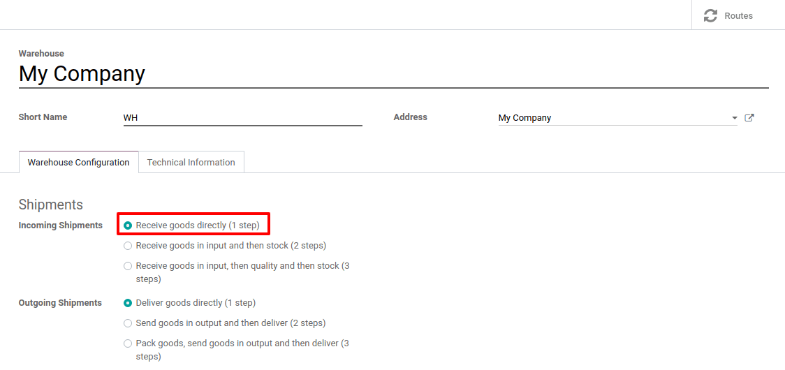 However, if advanced routes have been activated and you set another incoming configuration on your warehouse, you can set it back to the one-step receipt configuration. To do so, go to and edit the warehouse in question.