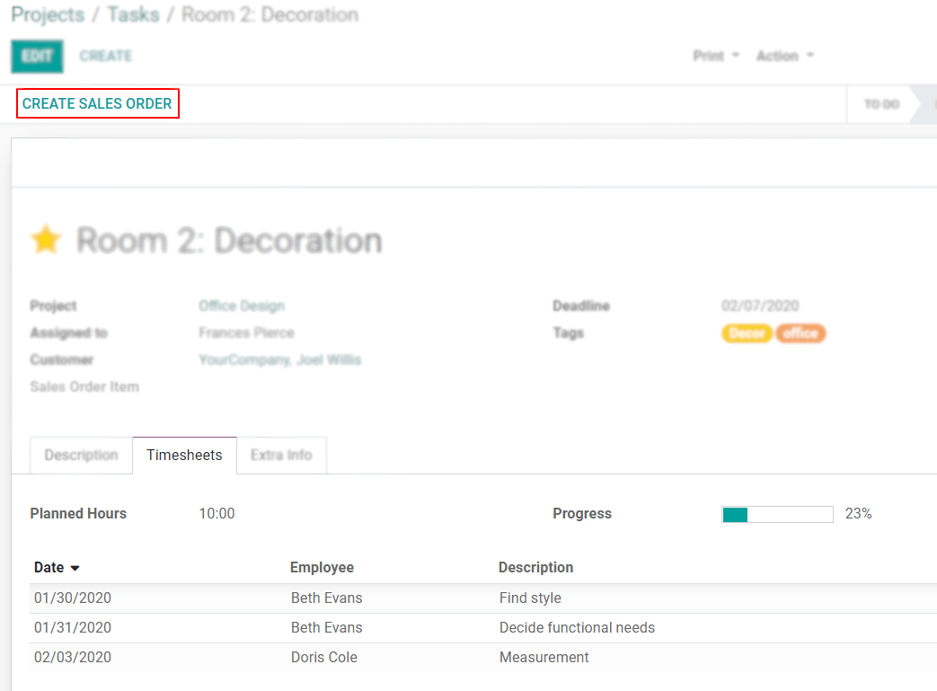 Once the time spent on a task under that project has been recorded, click on Create Sales Order